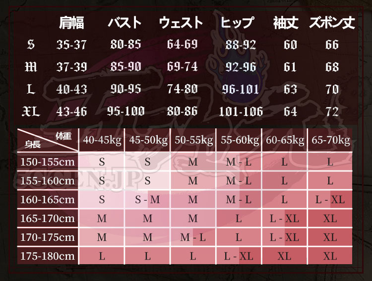 ①衣装は規定サイズ・規定数量でまとめて生産されていますので、サイズオーダー及びセット内容の一部を別サイズに変更する事は不可です。