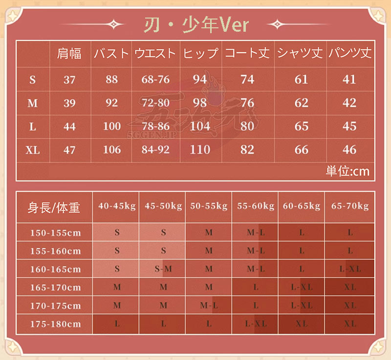 ①衣装は規定サイズ・規定数量でまとめて生産されていますので、サイズオーダー及びセット内容の一部を別サイズに変更する事は不可です。