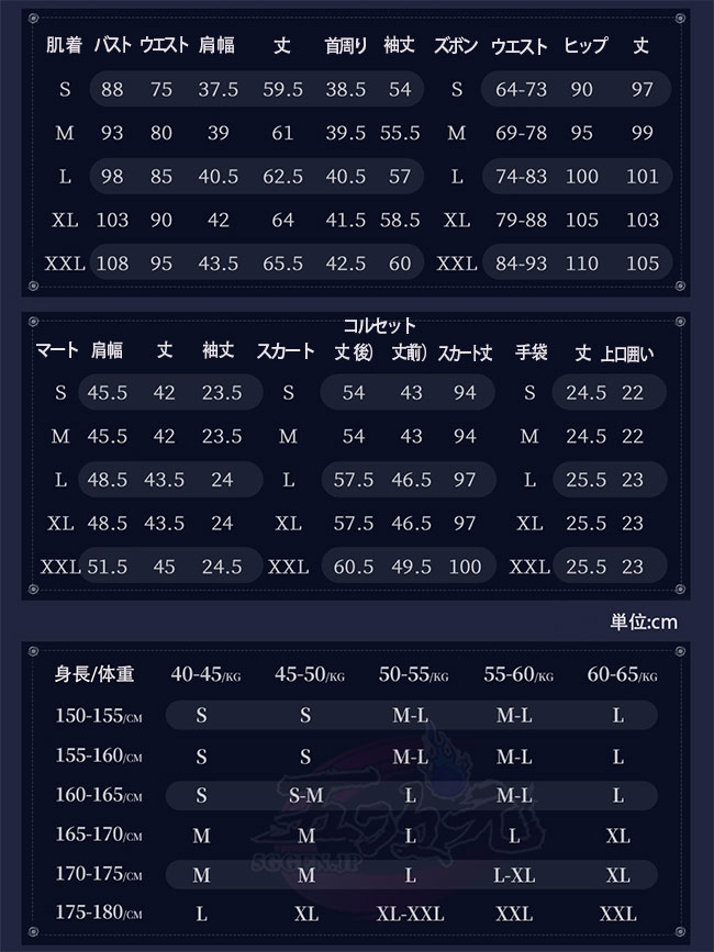 ①衣装は規定サイズ・規定数量でまとめて生産されていますので、サイズオーダー及びセット内容の一部を別サイズに変更する事は不可です。